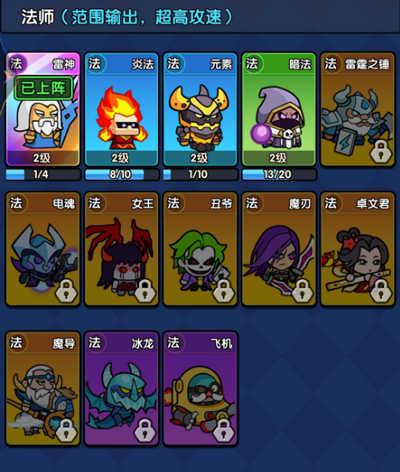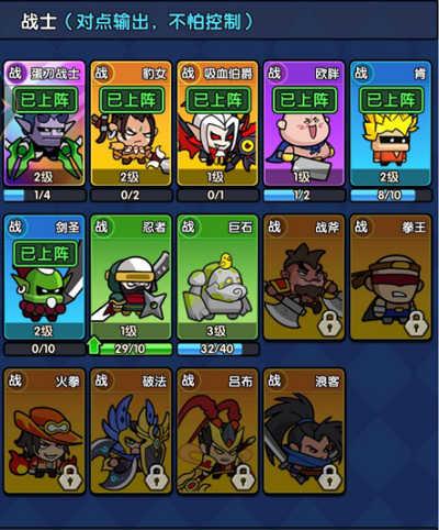 1、在游戏中,点击下方的角色即可进行上阵,选择一个后其余的两个角色就会消失。每个职业内部也会有不同能力的英雄,用金色,紫色,蓝色,绿色,不同的颜色来代表不同英雄的强度。