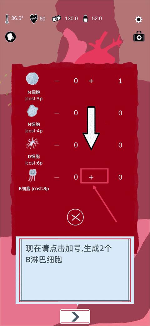 8、点击淋巴后会展开免疫细胞列表,点击+号后可以增加细胞数量