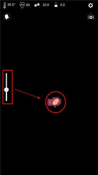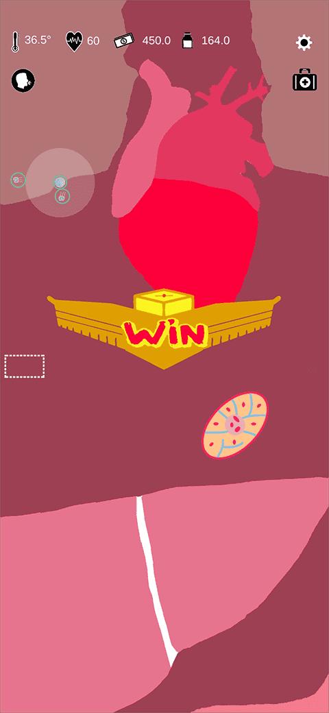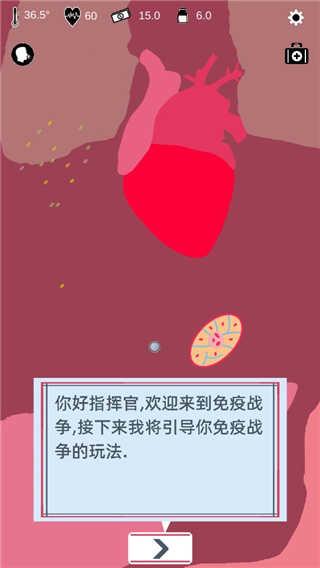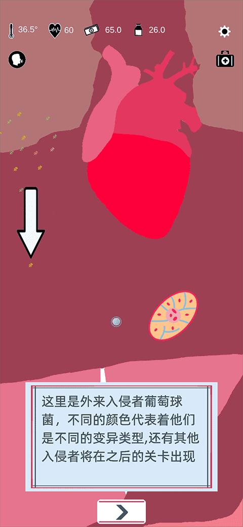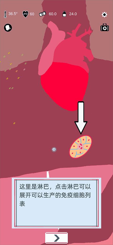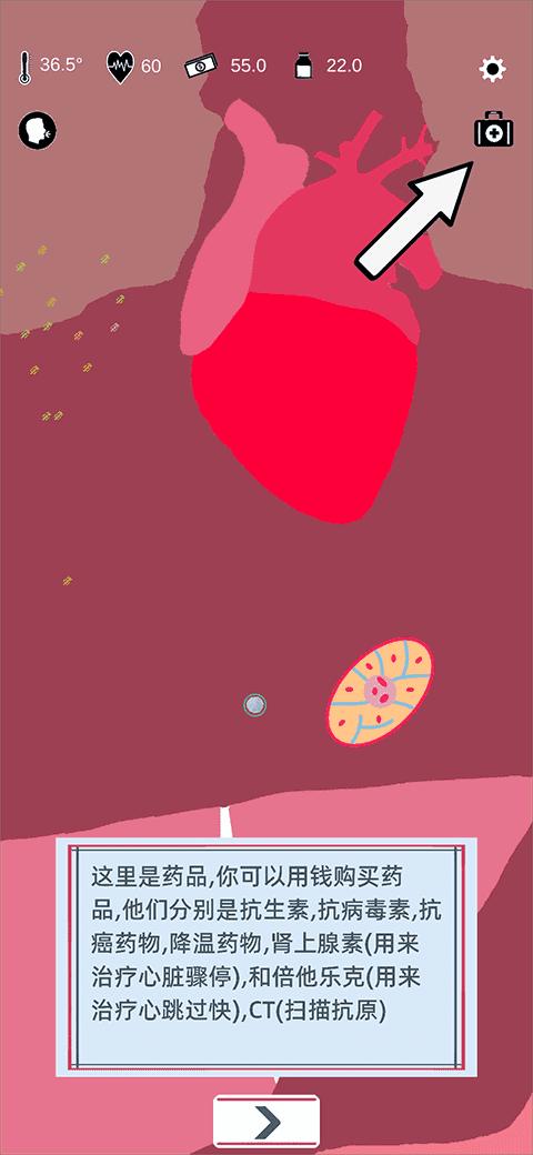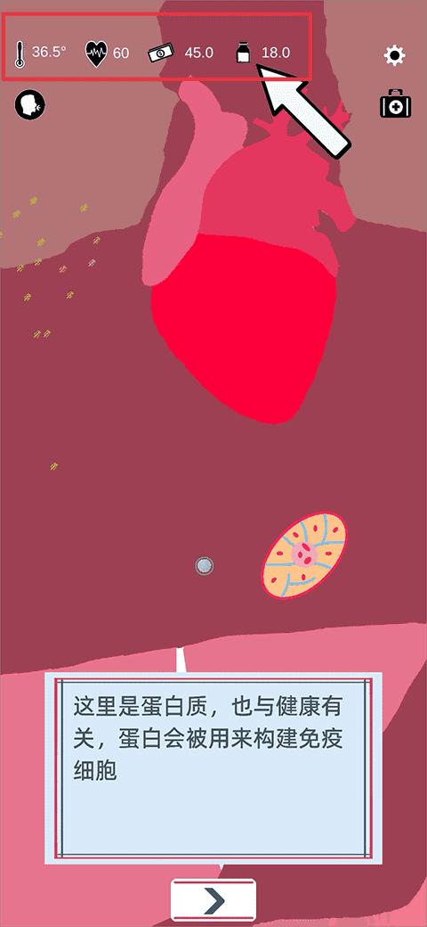 1、首先了解一下游戏的基本功能,左上角分别人体温、心跳、财富、和蛋白质