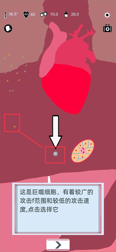 7、然后玩家需要点击巨噬细胞,将它移动到入侵者旁进行消灭