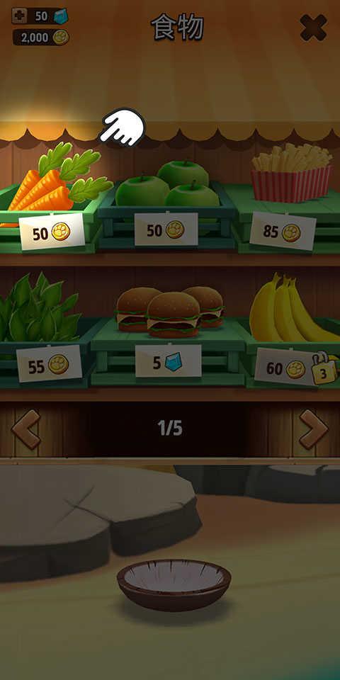 2、点击饭盆上的绿色加号后,再用金币或钻石购买食物进行放置。