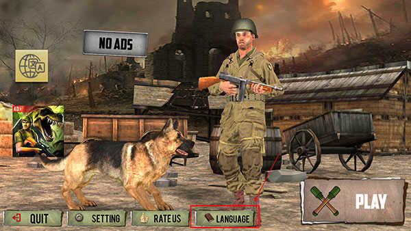 1、在勇气召唤第二次世界大战的主界面,点击左侧的【地球图标】,或者点击下方的【LANGUAGE】按钮。