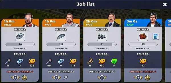 游戏为您提供任务,或者称之为“工作”。基本上你必须向他们提供一定数量的某种商品。没有时间限制,但有些工作需要某种类型的机车。您可以在上面的屏幕截图中看到,一些工作没有“合适的火车”,这意味着我没有任何合适类型的免费机车(史诗)。
