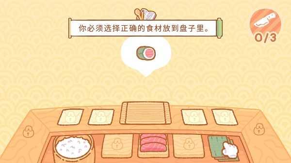 1、下载安装好库玛寿司吧游戏后,运行游戏,选择正确的食材放到盘子里;