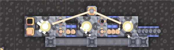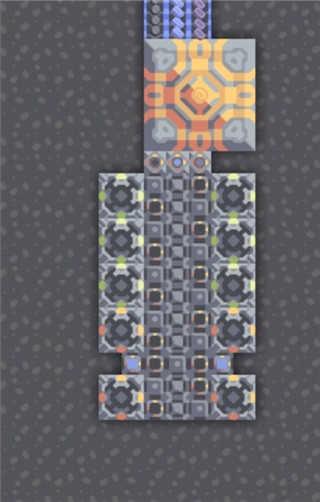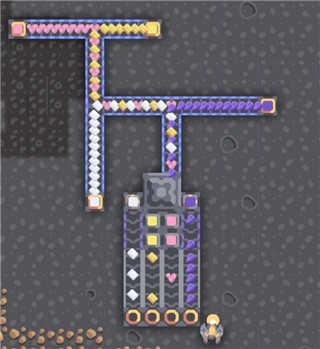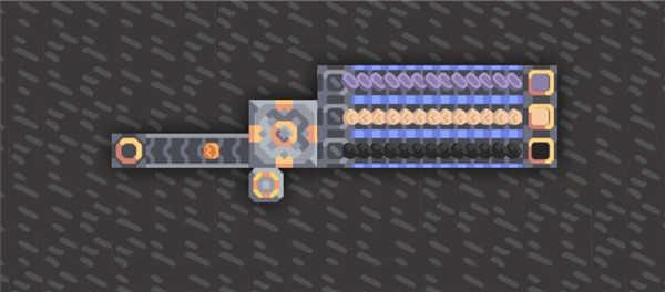这个也是放松了对材料的要求,没有追求满效率,让蓝图更好看。我觉得比较精妙的地方是那两个沙的分类器。原本没有上方的抽水机,沙子是直接运下去的,一个分类器直接承担了沙子,硅,煤三种材料的分配。加了抽水机之后也能负责把煤往下运,硅往左右运。