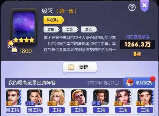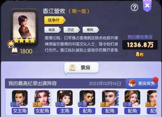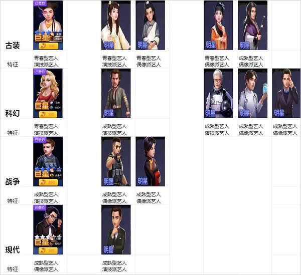 下面就是一些勉强破8的阵容,大部分的评分都是C,4星剧本就纯属于运气比较好,一个月内差不多就能抽到大部分,毕竟前期主力还是得走古装、科幻、战争这三个类型的艺人养。不然奥斯卡阶段性的排行奖励拿不到