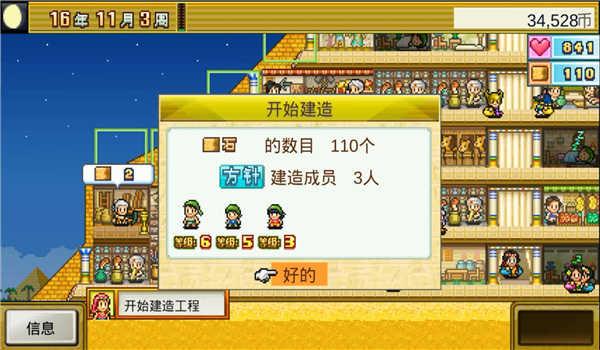 正式营业以后的玩法就和开罗的其他模拟经营类作品没有什么差异了。你需要雇佣一些勤快的员工,为他安排好工作岗位,之后再修建商店增加营业额,用多余的资金改善金字塔环境,让前来参观的游客得到最好的服务。游客的满意程度会转换成特殊货币“爱心”,玩家可以通过消耗爱心来升级设施属性或者是提升员工的能力。