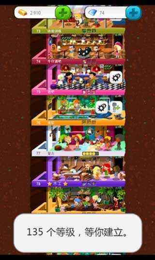 1、游戏的操作分两部分,建造地下城和接送顾客,建造只需要点击未开发的空地楼层就开始建造,不过开发空地还是建造房子都需要金币,而下方的三个按钮则是用来控制升降梯接送顾客到他们想去的楼层进行消费。