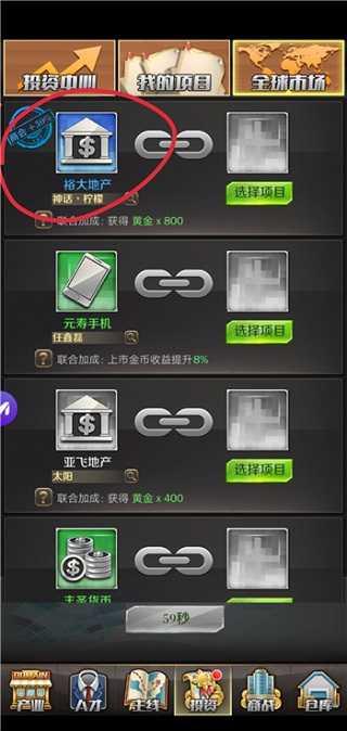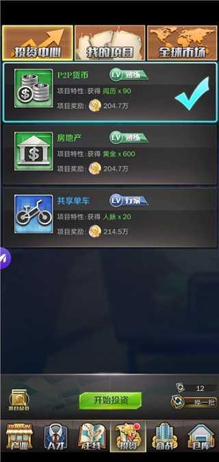 游戏中到了一定的称号,我们就可以投资了,投资可以获得大量金币,可用于人才升级。并且附加可以得到一些附属奖励,如钻石,金币,人脉以及阅历。