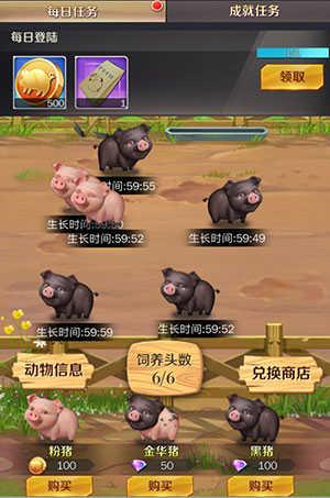 首先领取起步资金,买2头粉猪,4头100钻石的黑猪,(粉猪60分钟成年直接卖掉即可,苍蝇腿也是肉,养猪场有空位的时候不要放过),4头黑猪成年后,交配生出来的鹿猪保留,生的黑猪则养大卖掉。
