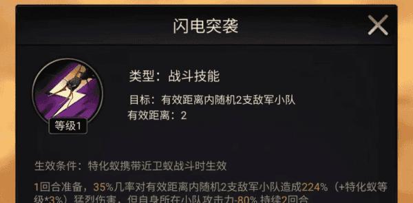 技能目标为特化蚁所在小队,初始军队整体攻击增加3.5%,满级之后提升至35%。