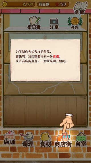 2、为了制作各式各样的甜品,首先呢,我们需要得到一份食谱。先去商店街逛逛,一切从采购开始吧;