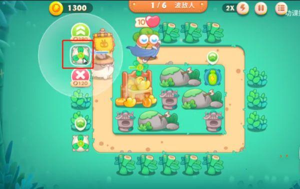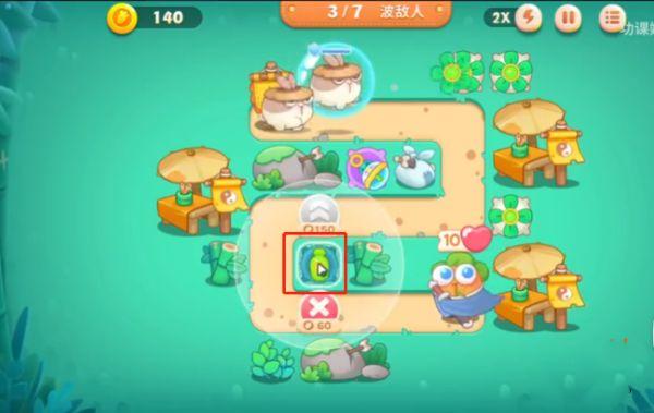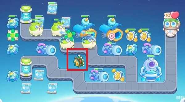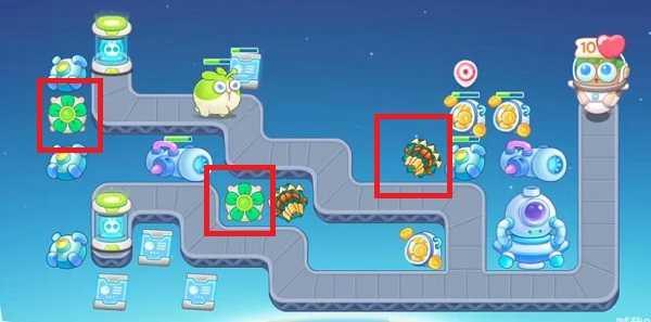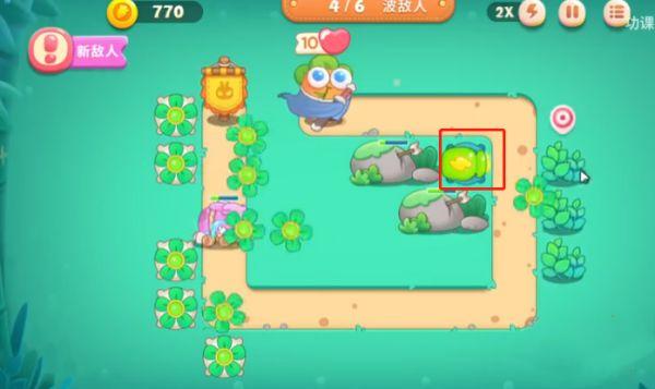 1、首先打开保卫萝卜4官方正版安卓版,我们进入关卡以后,在如图所示的红框位置放置1个分裂炮台,这样我们攻击怪的时候同时也可以攻击其他建筑物。