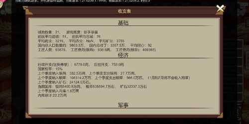 国库主要来源是各地收支,商业负责银两,矿业负责矿石,农业负责粮草,城市等级越高,收入也越高。内库主要来源是自宅产出+国库分成(分成比例占不清楚)-自宅支出-后宫支出-随从支出贸易与帝成差不多,高智力影响下限,高野心影响上限。不同点贸易的成功概率以及贸易需要花钱