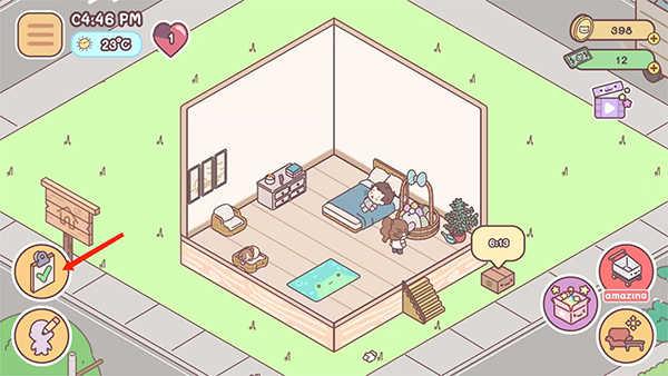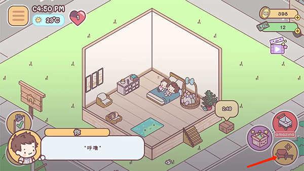 1、打开pocketlove游戏,注意房间右边会出现一个带着宠物的小女孩,点击她,