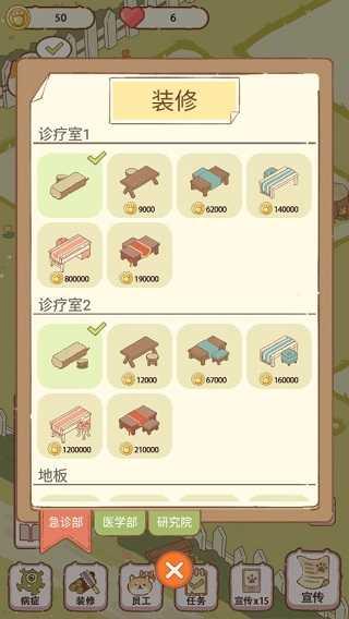 点击“装修”,可查看医院设施详情,接着点击“诊台”,选择购买即可!