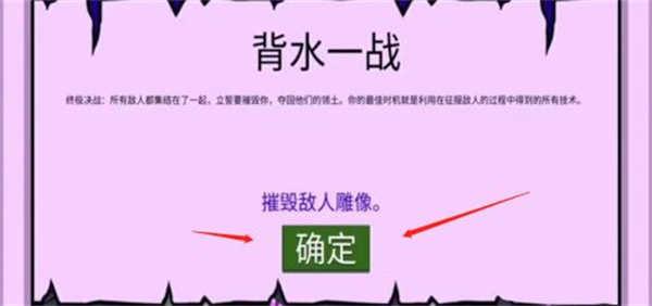 第十二关:最终对战,这时敌方用的是熔岩皮肤,十分强悍,前期两排剑士一排弓箭手,7个矿工发展经济(备上淘金热*3)后期养两巨人开路,两排弓箭手掩护,四排剑士拆雕像(备好剑士狂怒*2,一个拆雕像,一个防援兵),敌方雕像没血后会变出一个巨人(银甲大帝),这时赶紧撤退(防守模式),不要跟他硬刚,因为他伤害非常高。这时拿出对付巨人的套路,不过千万不要皮。打败他之后就会按照剧情发展,跟着剧情走就好了。