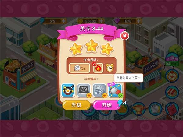 想三星通关的话,就是尽量在最短的时间内为顾客们呈上最多的食品,不要送错食物,让顾客的耐心消失。在此基础之上,完成我们的其他材料配比和甜品制作,争取赚到超过1200的金币就可以三星了。