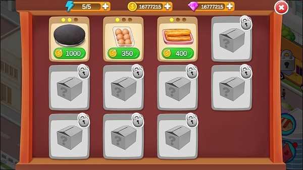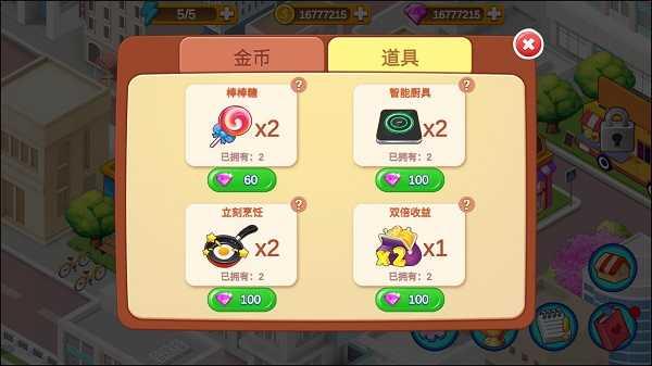 除此之外,还有一些辅助通关的道具。比如可以让食物瞬间烹饪完成,或是保证所有食物都不会被烤糊等等。这些道具虽然好用,但不完全免费(前期系统会赠送几个),需要用钻石去购买——钻石可以通过关卡、完成任务或观看广告来免费获取,当然,也可以花钱去购买。