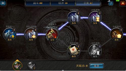 平衡天赋的加点,平衡天赋在发展过程中起着很大作用,因为它在发育时对各个建筑的属性加成包括医院容量、训练速度和其他很多地方都有加速和提升。这个加点也建议全部往后面加。加点稍微复杂的就是战斗天赋的加成,另外一点大家记得注意使用天赋技能,比如使用立即生产立马从城里田中收取五小时采集量,使用三秒回兵坑打你的人这些都是很实用的技能。
