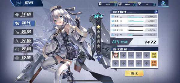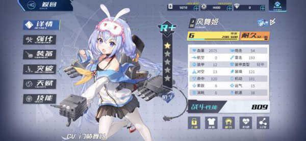 首先在船坞点击我们想要强化的舰灵进入“详情”界面,在这里我们可以看到舰灵的各种属性和战力值,也可以把自己最喜欢的舰灵设置为我们的秘书舰,24小时为你服务哦。