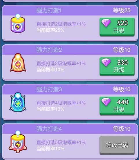 1、长期玩家优先把钻石用于升级【强化打造】,每档强化打造升到10可开启下一档,一共四档,满级分别为一档40级、二档30级、三挡20级、4档10级,强化打造等级越高,挂机收益越高,尽快把强化打造点满。