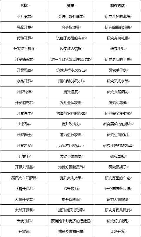 后期我们的开罗君等级已经很高了,这个时候战斗的主力就是开罗君,所以我们携带一些可以给开罗君增加BUFF效果的特殊开罗,比如导弹开罗增加速度、开罗侠提高开罗攻击力等。