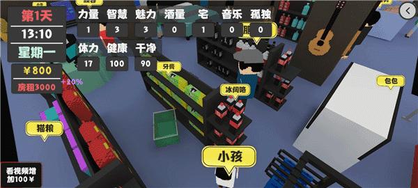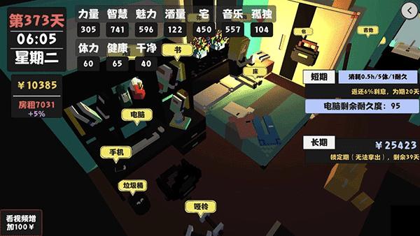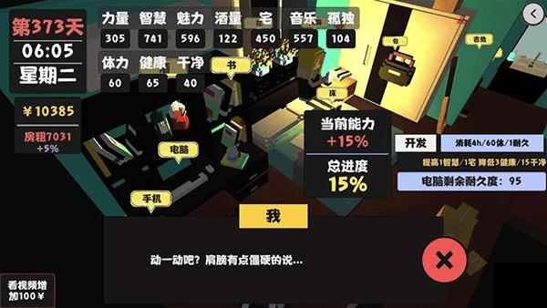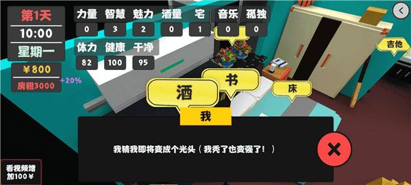 第二个月就有两个选择了,第一个是和第一个月一样。把每个属性刷到300+,把阿伟好感刷到100+(推荐这个)到第三个月再开始做游戏。第二个是,如果你不想刷了,那就开始做游戏,做游戏的同时刷阿伟的好感度,应该是一天做两到三次(自己视情况定),找阿伟聊四次天,阿伟好感刷到70,就可以在12点到13点蹭饭(很舒服),刷到一百就可以帮你推广游戏了。注意就是不要找插件!!做时间最短的体闲游戏,能做大概一万分差不多,卖6块。找阿伟推广。月底三到五天,去商店兼职赚房租。