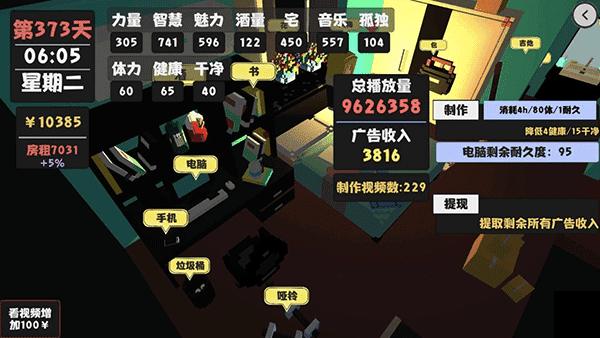 可以看到小编的广告收入有3816,基本上一天有500左右的收入,这个收入主要取决于视频数量和智慧、魅力、宅三个属性,哪个属性关联最大小编不知道,但是视频数量多是真的重要。视频数量越多每分钟获得的钱就越多,因此日积月累的刷数量可以让玩家躺着赚钱。
