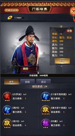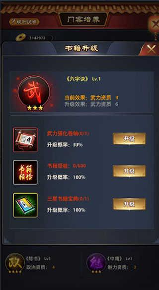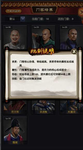 以及门客的资质很重要,建议培养哪个门客就用卷轴或者攒书籍经验升级(个人推荐书籍经验,因为是百分之百成功率,虽然慢了点,但是有保证)