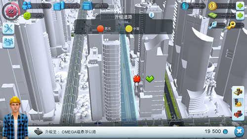 在玩家点进道路选项进入道路菜单栏里之后,就可以看到右下角有三个选择,它们分别是修建道路,升级道路和拆除道路。选择第二个升级道路,就可以看到当前城市的道路拥挤情况,黄色代表中等,红色代表恶劣。当道路的颜色是黄色甚至是红色时,市长大人您就需要去升级道路了。