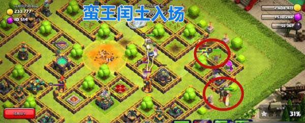 1、小编大致地画出了大部队的行进路线,女王配合咏王作为进攻的主力,冰人跟进抗住第一个投石炮的伤害,镜像法术留给天使,蛮王和闰土中途进场,时机是女王和咏王抗住了大本营的伤害以后,剩下的兵种可以根据实际情况来决定,最后会剩下许多部队小伙伴们不用担心兵种不足的情况。