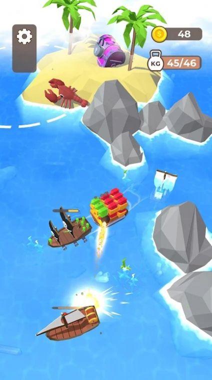 玩家在这里需要在海上驾驶船只航行,海上的线路不是很安全,我们不时就会遇见一些海盗,这时候就要拿出炮台将它们放置在合理的位置开始战斗,两架相同的炮台能够合成更高一级的炮台,高级炮台可以用来完成任务,低级的用来战斗。