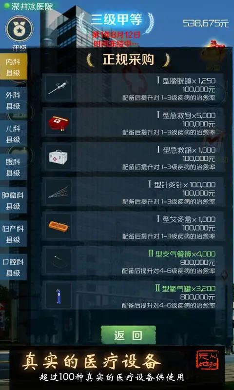 1、游戏内科室分为县级、市级、省级、国家级、世界级五个级别,科室等级将影响病人的数量和疾病的等级,科室等级可通过扩建提升;