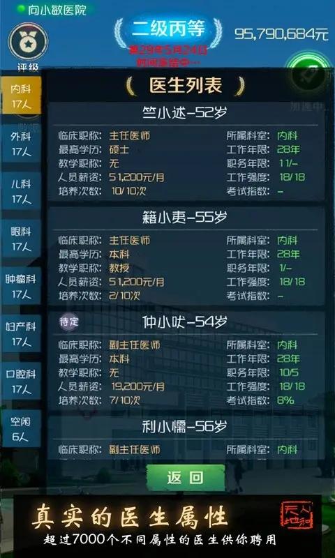 1、游戏内所有医生通过招聘获得,医生拥有不同学历,学历影响医生通过临床职称考试的概率;