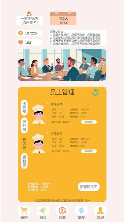小火锅的筑梦之旅游戏是一款以火锅店为背景的模拟经营文字类游戏,通过较为真实的文字模拟让玩家感受到经营一家火锅店的不易,希望大家在游戏中感受经营的乐趣与创业的艰辛。
