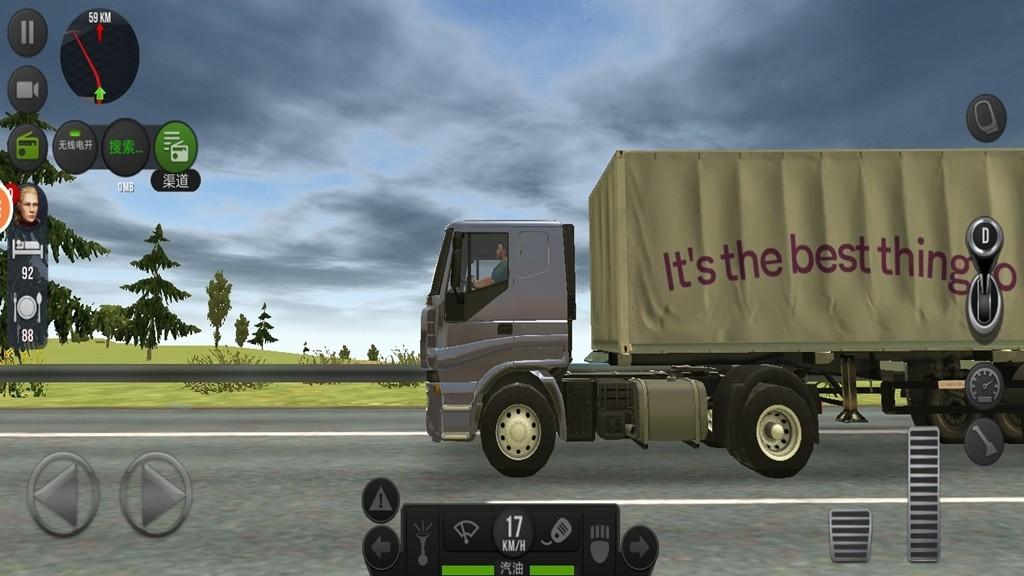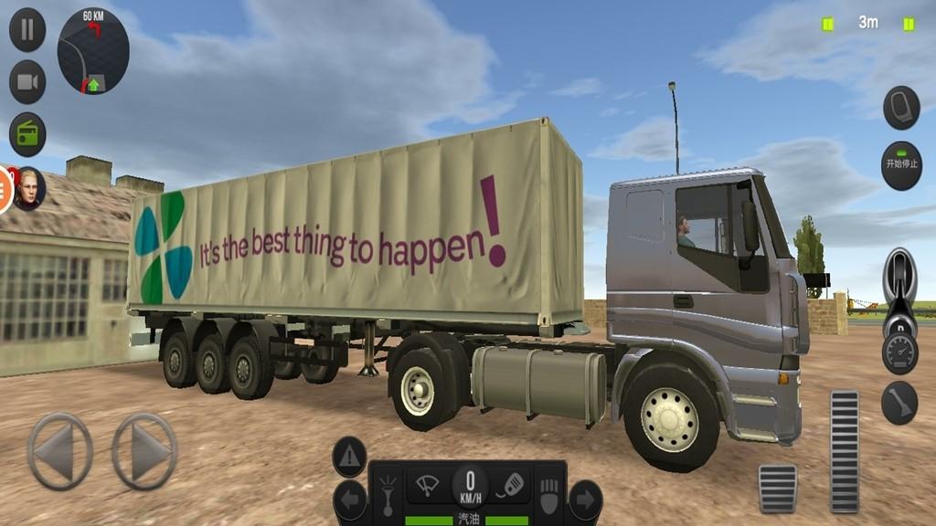 1、屏幕虚拟按键控制卡车行驶、转向、换挡等操作,界面显示油量、速度、任务信息等。