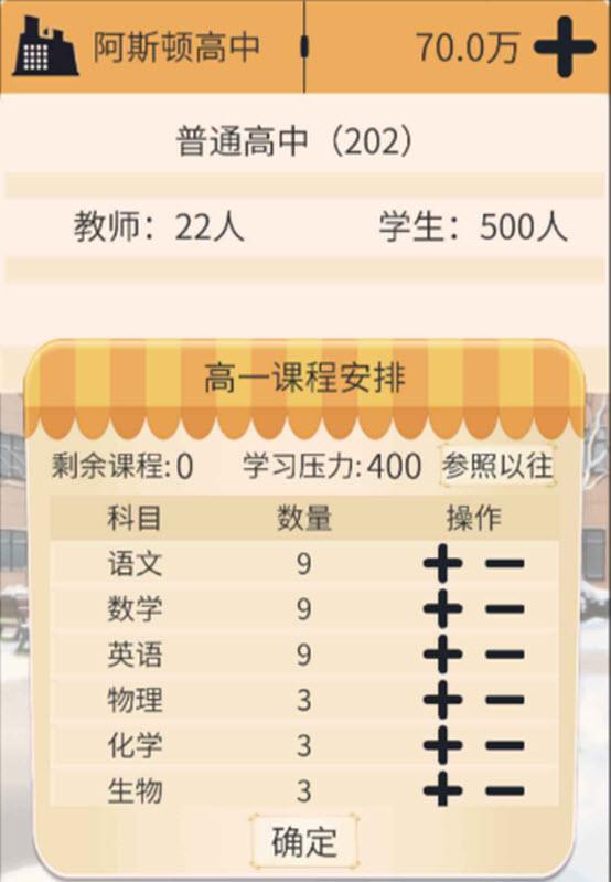 1、游戏最初开始我们只有高一年级,在排课程表的时候文化课要平均一点,另外还要加一些艺术课程,这样学生就比较轻松。