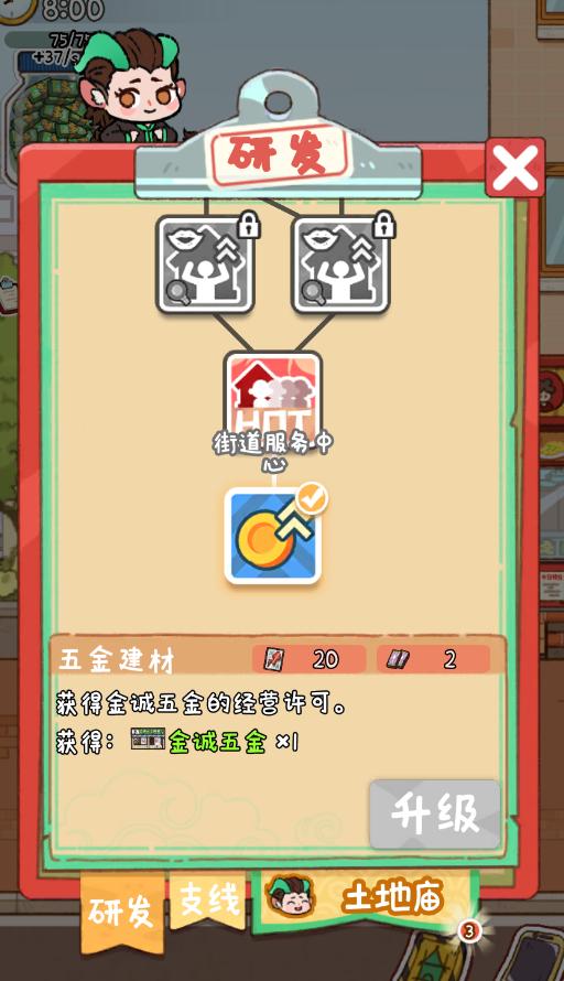 店铺经营:玩家可以购买并升级店铺,提升店铺人气和收益。升级道具能够让店铺的单次收益获得提升,每个道具的属性都不同。