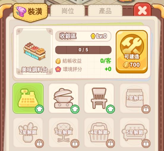 2、点击想要建造的物品,升级餐厅的星数可以解锁更多的餐厅家具。