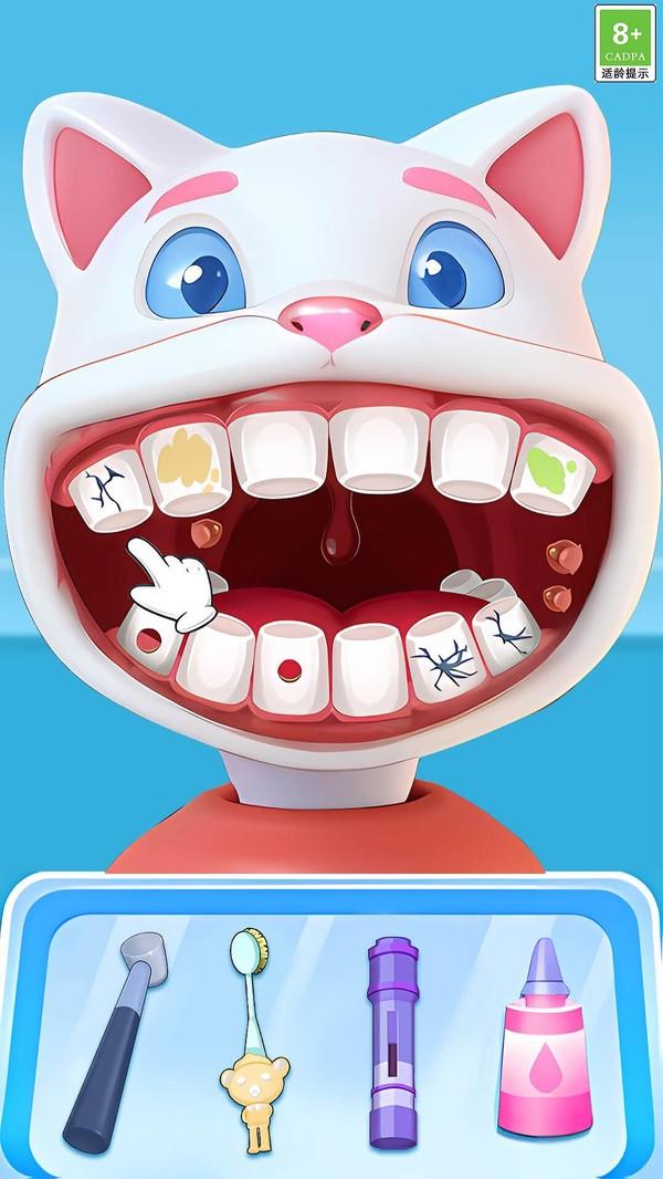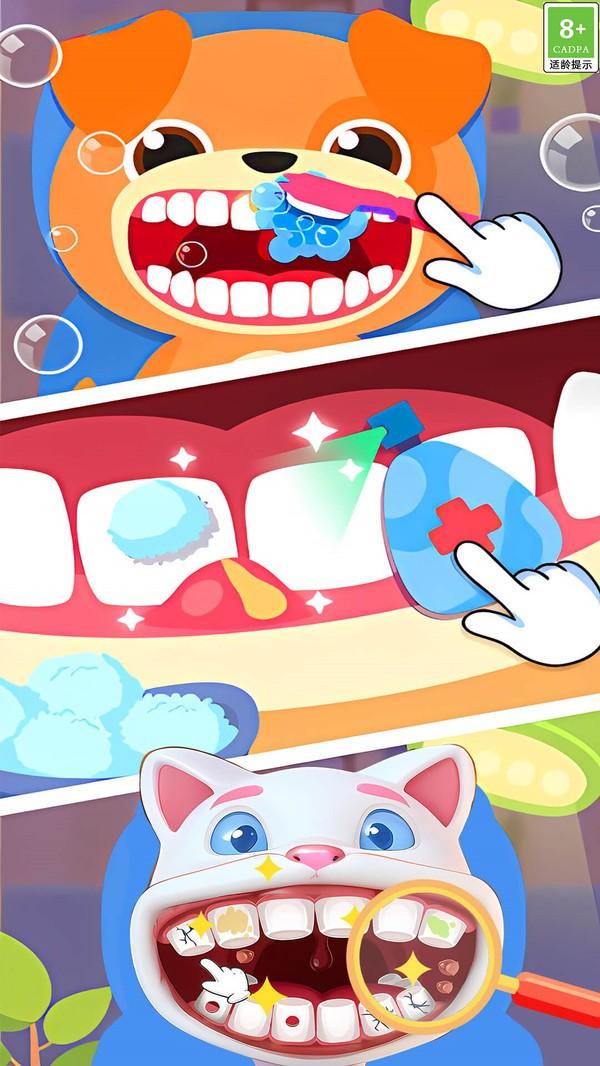 1.用游戏中提供的各种工具,如牙刷、牙线、漱口水等,为小动物们进行牙齿清洁和治疗