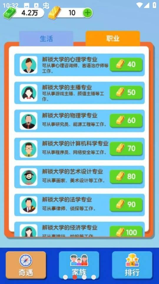 人生模拟器合集游戏融合了《纸牌人生》,《欢乐方块屋》,《模拟人生》,《逆袭人生》等一系列经典模拟经营游戏。您可以在主界面自由选择您感兴趣的游戏,开启不一样的生活体验。从牙牙学语开始,通过文字上学,工作,结婚,生子,过上理想的生活。