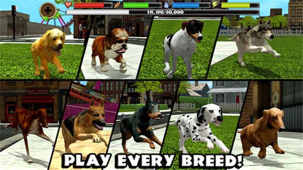 通过流浪狗模拟器,挑选自己喜欢的品种,过着流浪狗的生活!生存在一个巨大的城市,充满了危险的狗和猫的决斗!建立你的狗包,挖埋骨头,德国牧羊犬,哈士奇,拉布拉多犬争夺和追求你的生活!