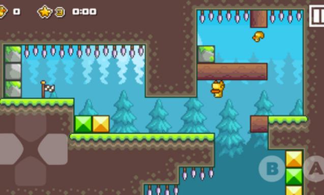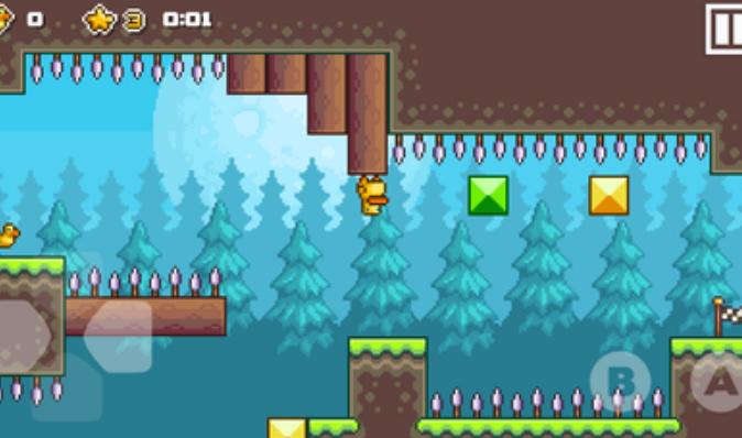 2.点击虚拟键盘的方向键来控制小黄鸭移动,A键改变小黄鸭的重力方向,B键是本作新增的跳跃按钮