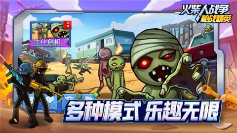 火柴人战争枪战精英是一款火柴人题材的策略战争闯关游戏,游戏有很多玩法,不仅有实时战斗模式,还有生化模式,在游戏中杀死各种僵尸,来体验一下吧。尝试更多有趣的模式,招募不同的火柴士兵战斗,并参与许多激动人心的战斗。你可以解锁更多不同的武器来提高火柴人的战斗能力,这样他们就可以更好地杀死敌人。