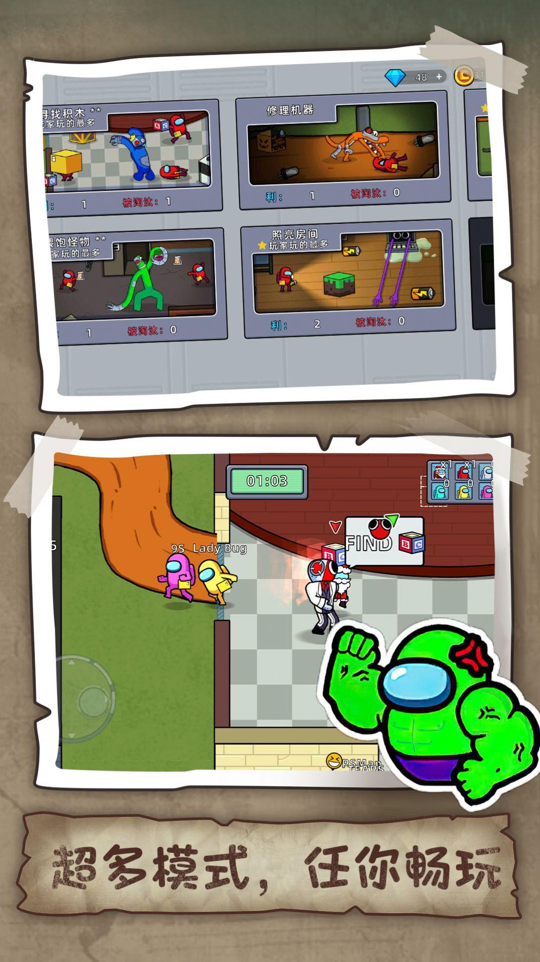 狼人杀潜行大师游戏下载安装是一款十分好玩的冒险逃生游戏,在这个彩虹朋友举办的太空狼人杀的派对中,你需要完成派对中的各种任务,解开各种谜题,逃离彩虹怪物朋友的追逐,匿藏并且活下来!