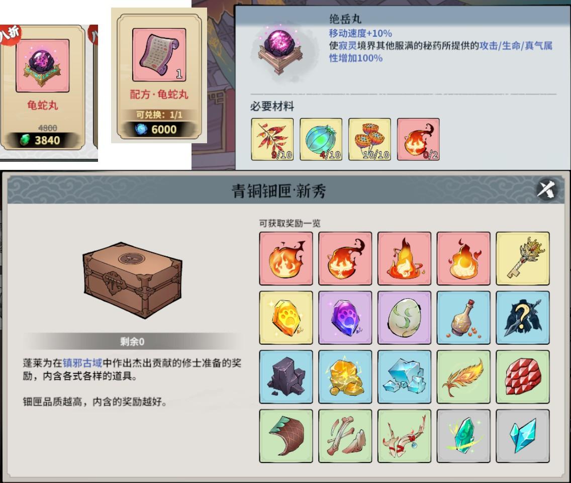 以上养成部分主要是这样,总结就是:优先升宠物并进阶。装备有强化材料就升,不刻意刷。资源副本全用来刷草药,灵石和须弥尘统统拿来炼丹药。