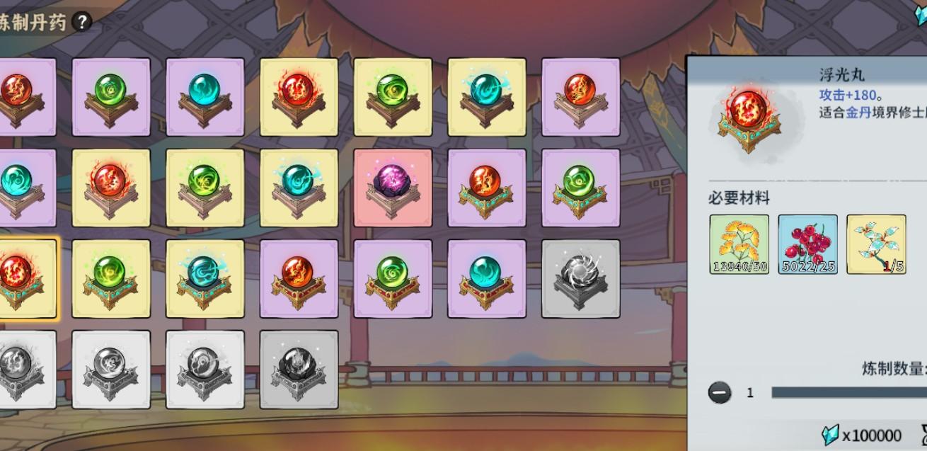 如果你搞到了中间的那颗红丹药(充钱直接买,或者肝后期自己炼),这个境界其他丹药效果都翻倍!