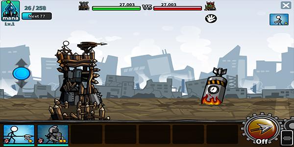 卡通战争3又名CW3,是一款即时策略塔防游戏,为卡通战争系列的新作,画面上采用经典的火柴人画风,在玩法上与猫咪大战争相似,玩家需要利用金钱不断的购买士兵借此来摧毁敌方的堡垒来获取胜利。