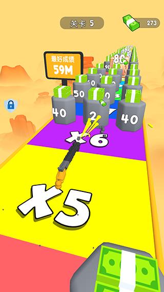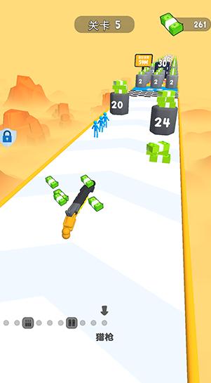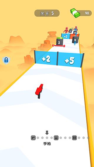 2、跑酷玩法造型有趣,游戏中在跑酷的玩法之外,让小人变身枪支的造型,酷炫又有趣,让游戏的玩法更加丰富。